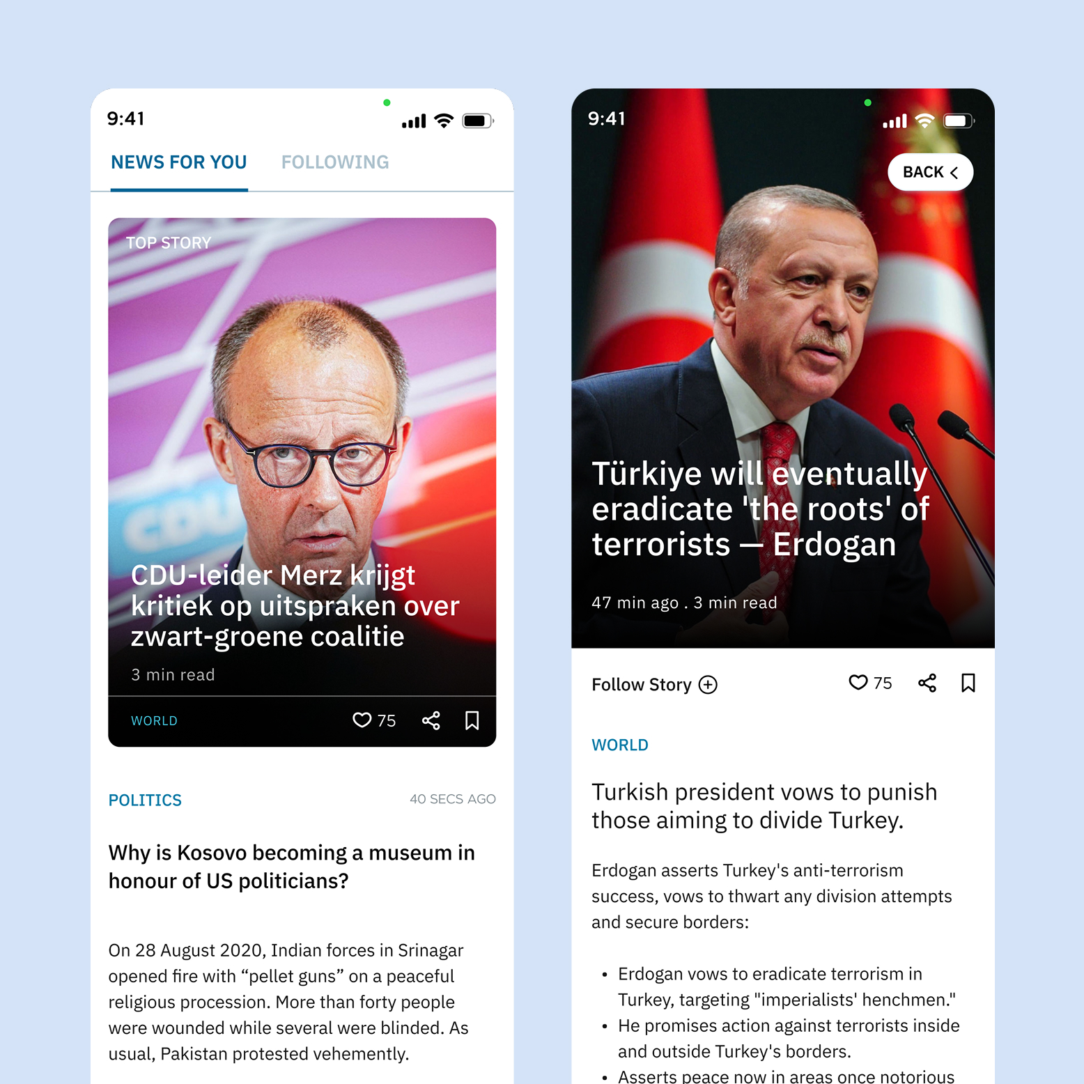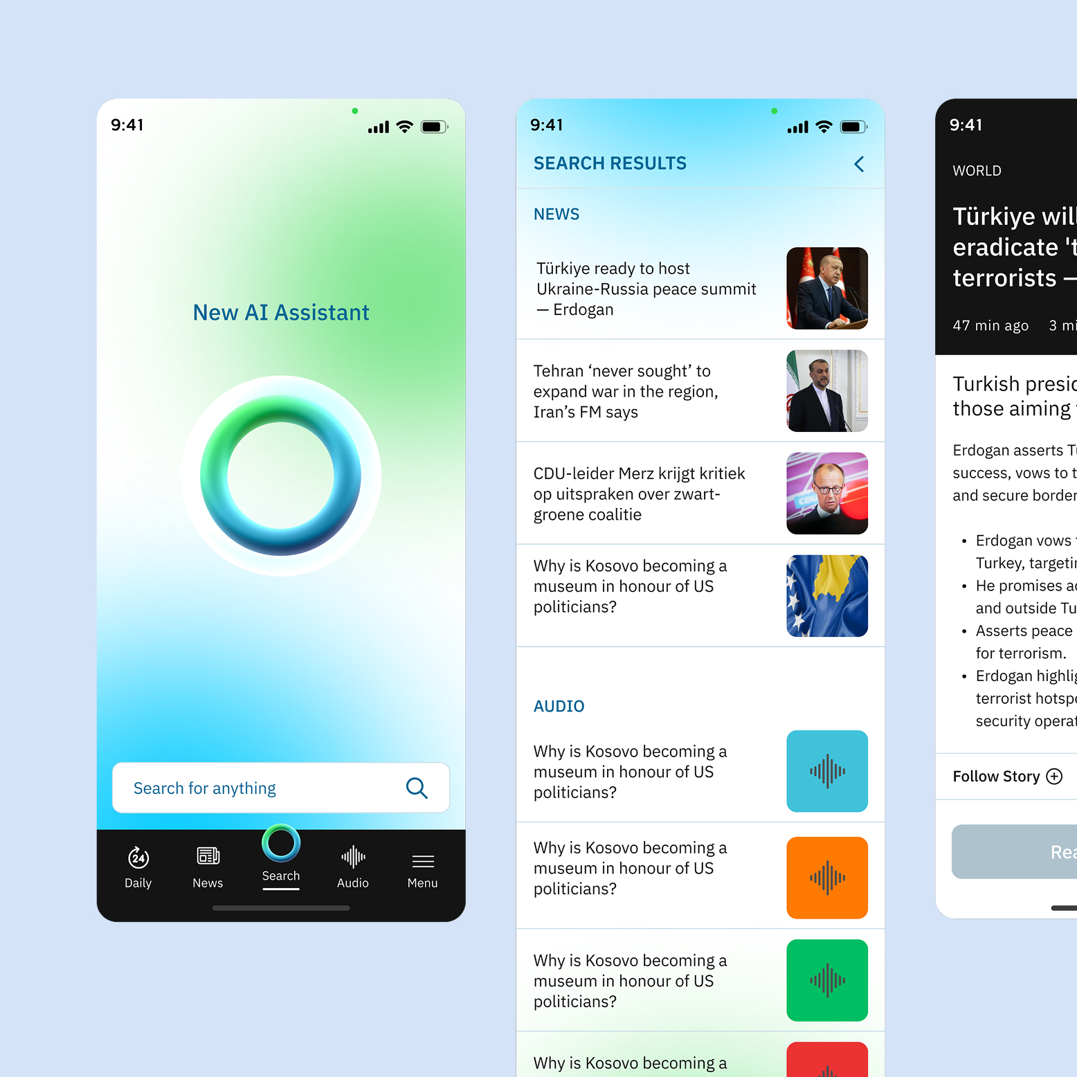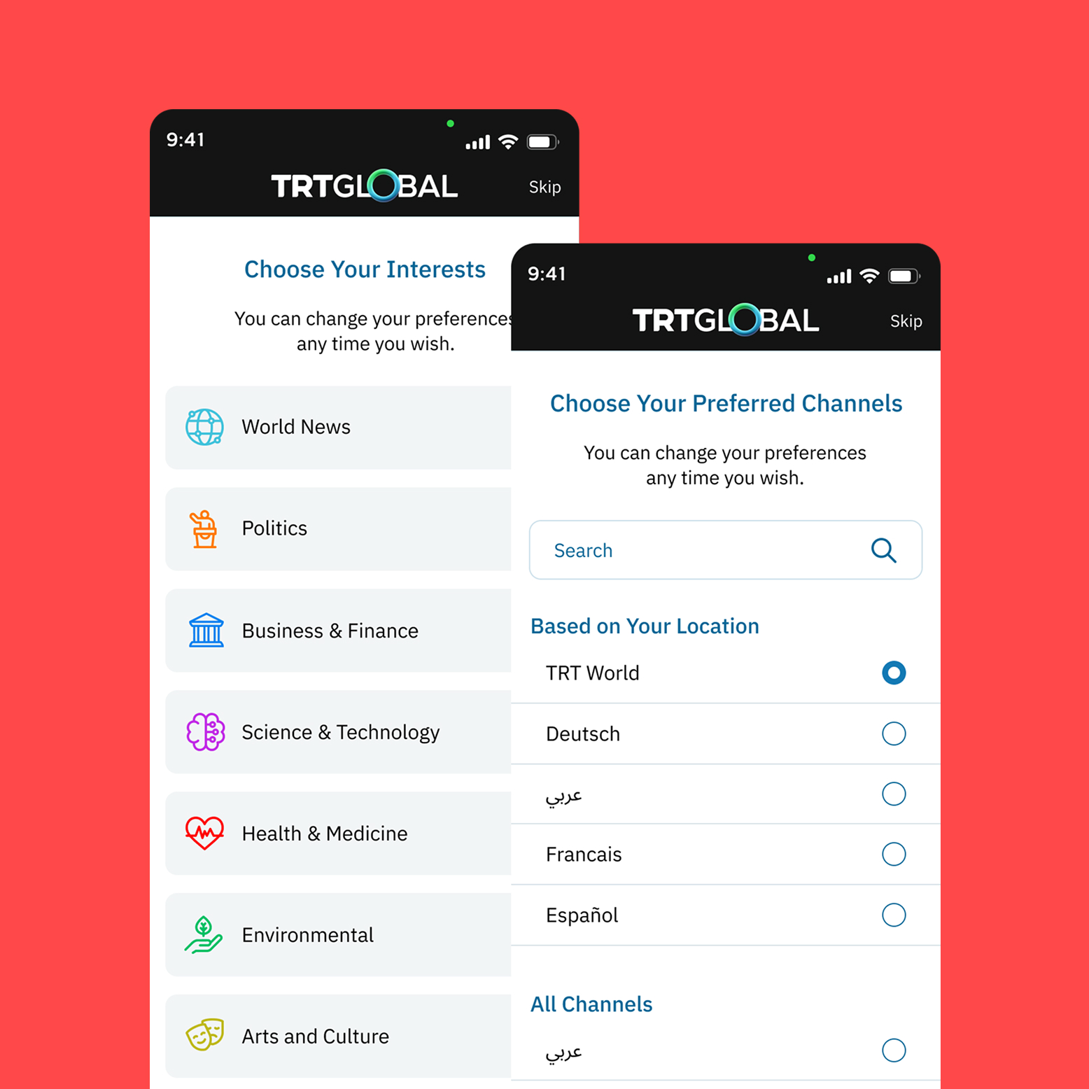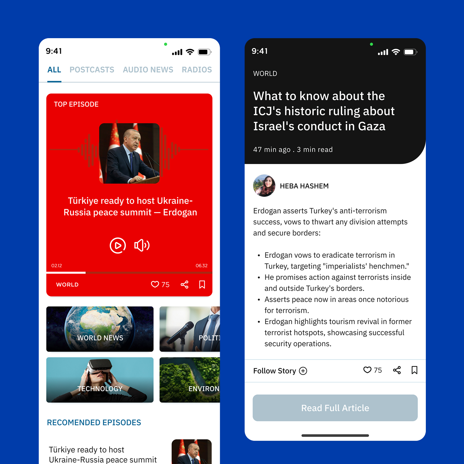 TRT’s global news brand, TRT World, delivers Turkey’s perspective to international audiences through news, programs, and live broadcasting. We led the complete UI/UX design of the TRT World mobile application—from user journeys and information architecture to a full UI system—creating a modern, broadcaster-grade experience built for speed, clarity, and trust.